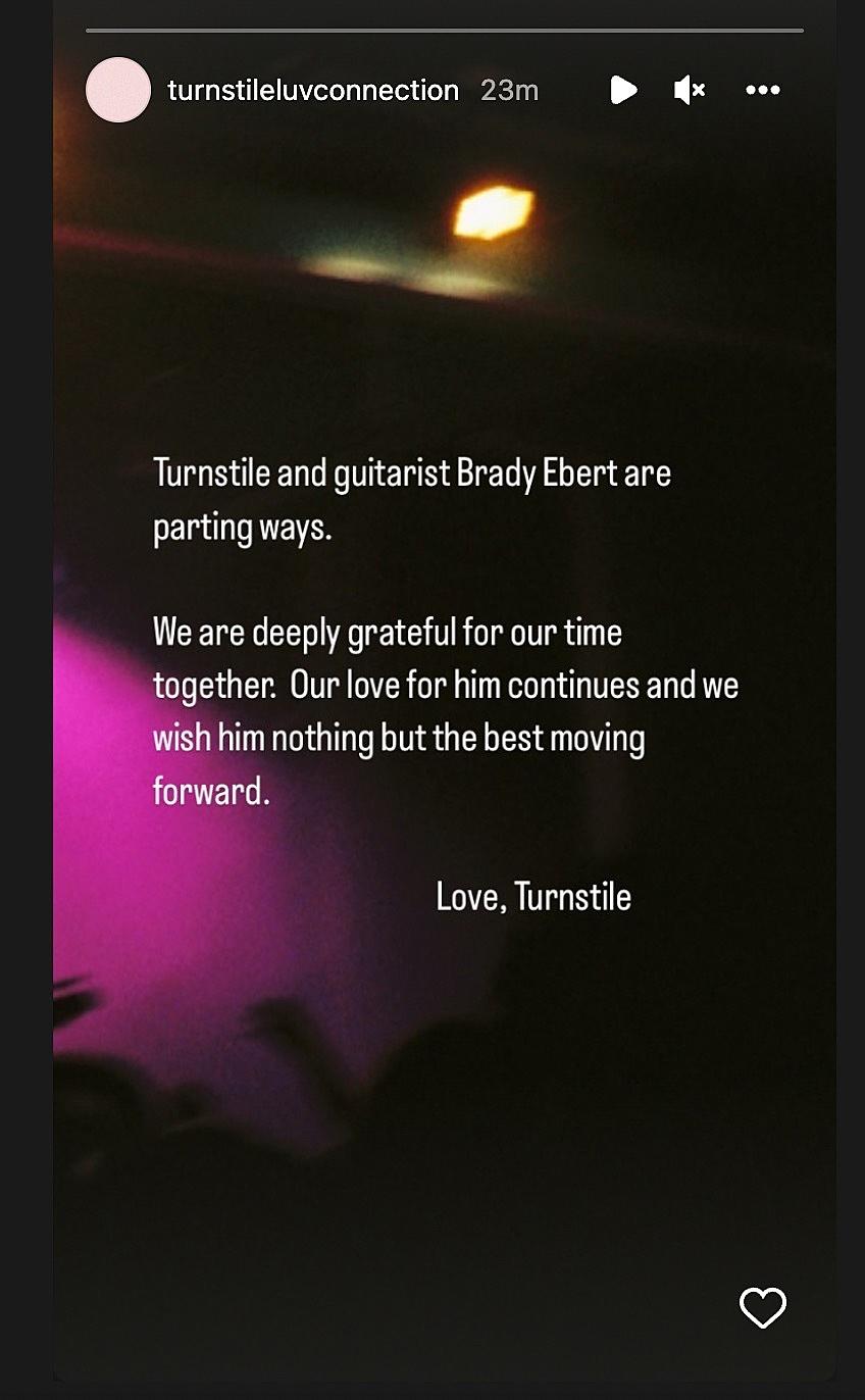 «Turnstile y el guitarrista Brady Ebert se han separado. Estamos profundamente agradecidos por nuestro tiempo juntos. Nuestro amor por él continúa y le deseamos lo mejor de ahora en adelante».
