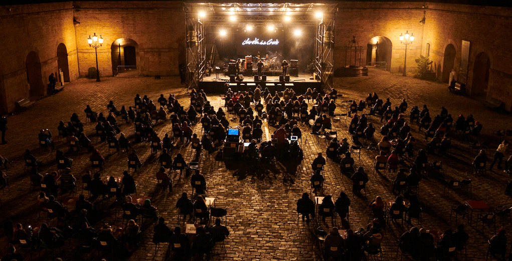 Tras pasar por el preceptivo control de temperatura, desinfección de manos, el obsequio de una manta de lo más útil, y ser conducidos al asiento asignado, la música tomaba el protagonismo.