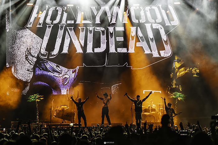 Estar faltos de rodaje no es algo de lo que pueda culparse a Hollywood Undead. Los segundos invitados de la noche es otro grupo al que cuesta de ubicar y del que parece que su mayor objetivo sea el de montar la mayor fiesta posible. Con unas palmeras luminosas adornando el escenario, el sexteto llamó la atención por sus pintas (teníamos al cabecilla Johnny 3 Tears en plan macarra cachillas, a Danny Murillo con un look a lo Chester Bennington, a Dylan Alvarez que parecía Bruno Mars con gafas de sol y camisa hawaiana…) y por ir alternando los instrumentos con las tareas vocales. Arrancaron con su hit ‘California Dreaming’ y de inmediato tuvieron al público a sus pies con temas como ‘Riot’ o ‘Everywhere I Go’ durante el cual tiraron unas pelotas de playa gigantes. Como si fueran unos Crazy Town de juerga con Eminem, aunque con peores canciones, tuvieron a la gente entretenida, pero el chiste empezó a perder gracia de la mitad para adelante.