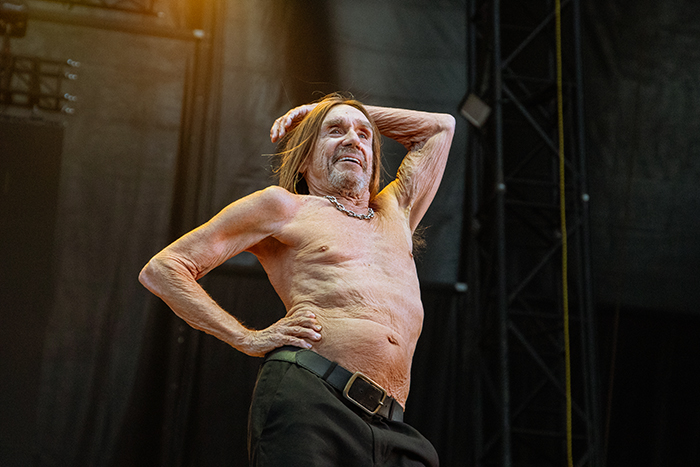 Para nuestra suerte, 20 minutos después y tras un amago fallido, los inconvenientes quedaron resueltos y pudimos disfrutar del padrino del punk por enésima vez. Obvio que Iggy ya no es ese animal salvaje que vimos en su día durante la reunión con The Stooges. A sus 78 años arrastra una cojera importante y su sempiterno pecho al descubierto exhibe tantas arrugas como una pasa. Seguro que él mismo es consciente de estar en el ocaso de su carrera, pero como buen superviviente, volvió a dejar claro que morirá con las botas puestas. Gracias a una banda que sonó espectacular y muy especialmente al acompañamiento de una sección de vientos que le daba un toque distinto a los clásicos de toda la vida (hubo mucho de Fun House y Raw Power: ‘T.V. Eye’, ‘Raw Power’, ‘Gimme Danger’…), mister Osterberg fue una vez más todo pundonor y actitud a pesar de sus limitaciones físicas.
