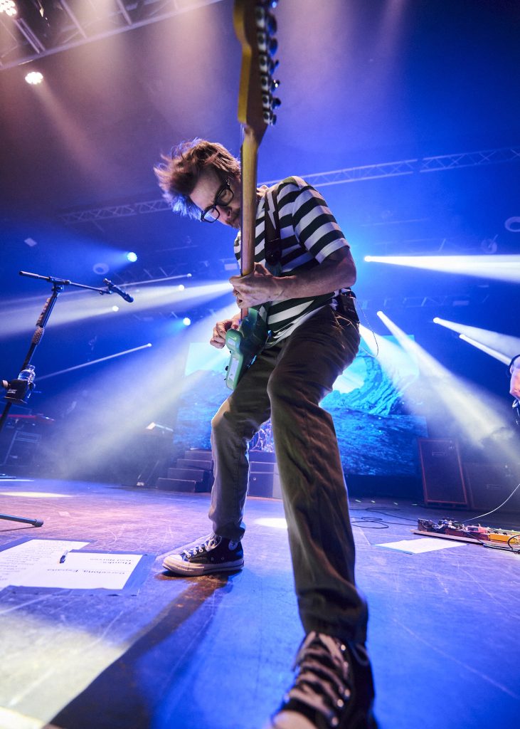 Con hardcore fans venidos de toda España -de esos que se saben todas sus caras B y discuten sobre si es peor Ratitude o el Black Album-, el ambiente en la sala grande de Razzmatazz era como el de un Weezer Cruise en tierra. A pesar de salir al escenario con casi 20 minutos de retraso, Rivers, Brian Bell, Scott Shriner y Patrick Wilson fueron recibidos con una ovación de gala. Arrancaron con la semi instrumental ‘Anonymous’ de Everything Will Be Alright In The End, como si quisieran tantear el terreno para, acto seguido, atacar con ‘Hash Pipe’. Escuchando el riff y los coros del que fuera primer single del Green Album, me vino a la cabeza aquella brillante definición que Chino Moreno de Deftones hizo de Weezer: «Son una banda de arena rock fingiendo ser nerds tocando arena rock». Es justo eso.
