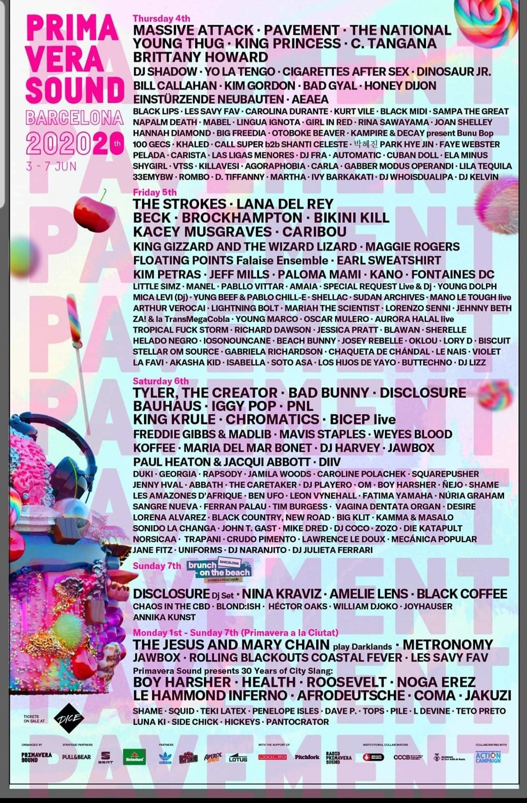 El cartel completo del Primavera Sound 2020 ya está aquí. The Strokes, Massive Attack, Pavement, The National, Lana Del Rey, Beck, Iggy Pop, Tyler The Creator, Bauhaus son algunos de los nombres más destacados entre un total de 211 artistas que actuarán en el año en el que el festival barcelonés llega su 20 aniversario.