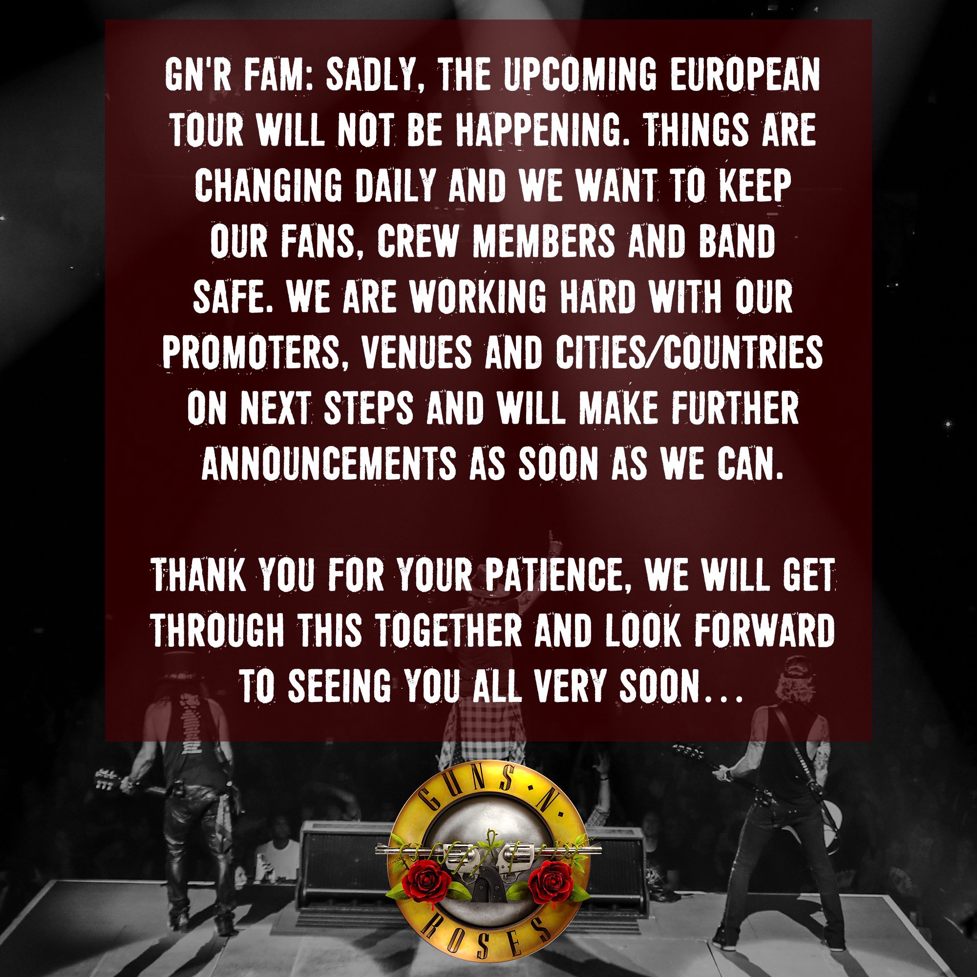 No hacía falta ser un genio para saber que Guns N’ Roses no podrían realizar su inminente gira europea por culpa del COVID-19. Finalmente ha sido hoy cuando la banda ha anunciado oficialmente la cancelación de todos sus conciertos, incluido el del 23 de mayo en el estadio Benito Villamarín de Sevilla.