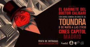 Si te gusta la música y el cine, ahora tienes la oportunidad de disfrutar de ambas pasiones en un mismo evento. El próximo 8 de mayo Toundra estarán en los Cines Capitol de Madrid interpretando música hecha expresamente como banda sonora del clásico del cine expresionista alemán El Gabinete Del Doctor Caligari de Robert Wiene.