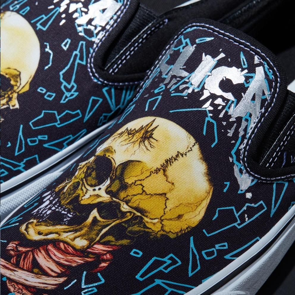 Pushead lleva colaborando con el grupo desde 1986 proporcionando ilustraciones para sus libros de gira, camisetas o escenarios, como las calaveras gemelas que aparecen estampadas en esta colección disponible en los modelos Sk8-Hi y Classic Slip-On.